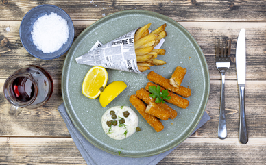 A tasty fishless fillet in a golden breadcrumb served with chips, and plant-based tartare sauce